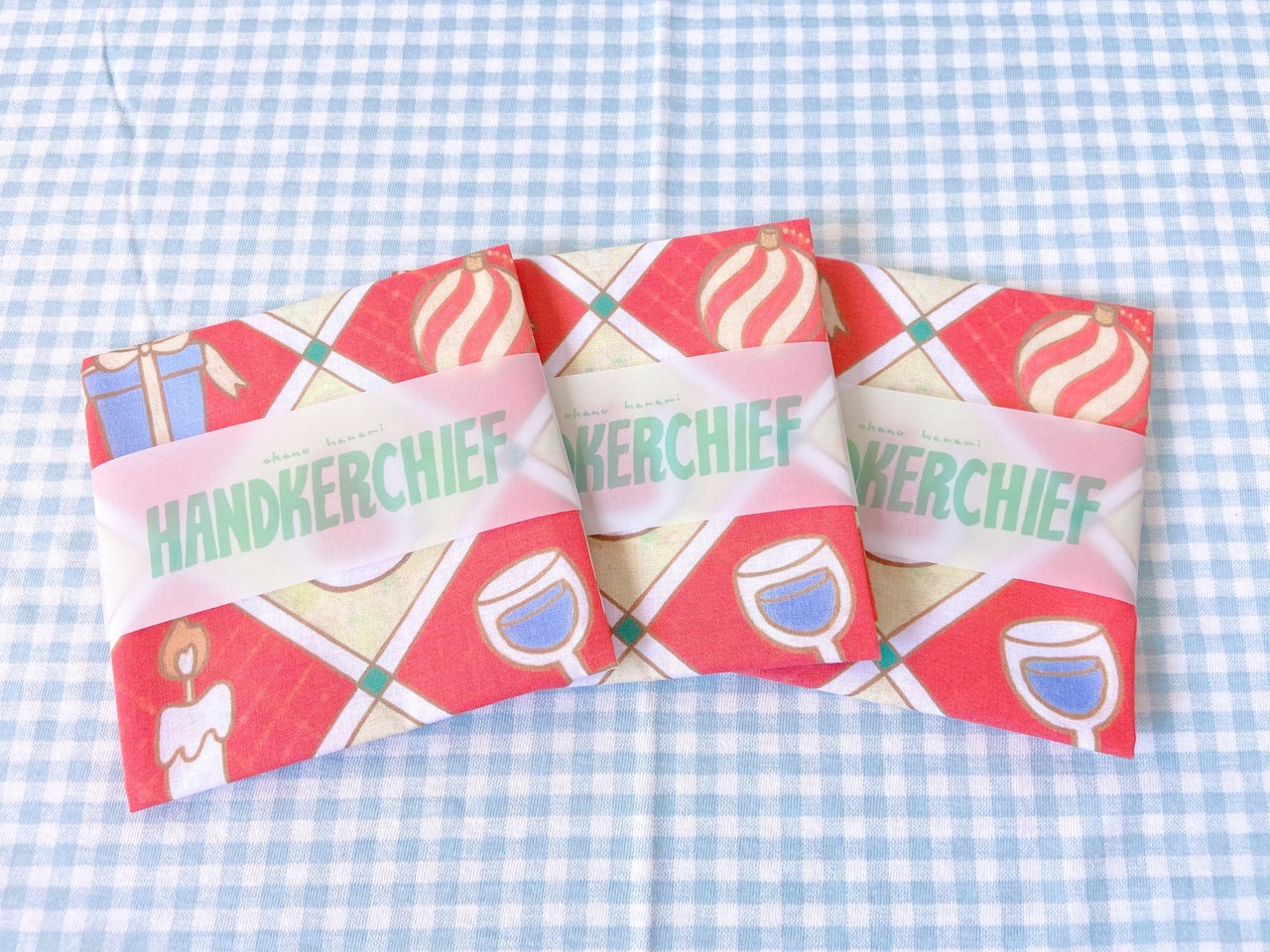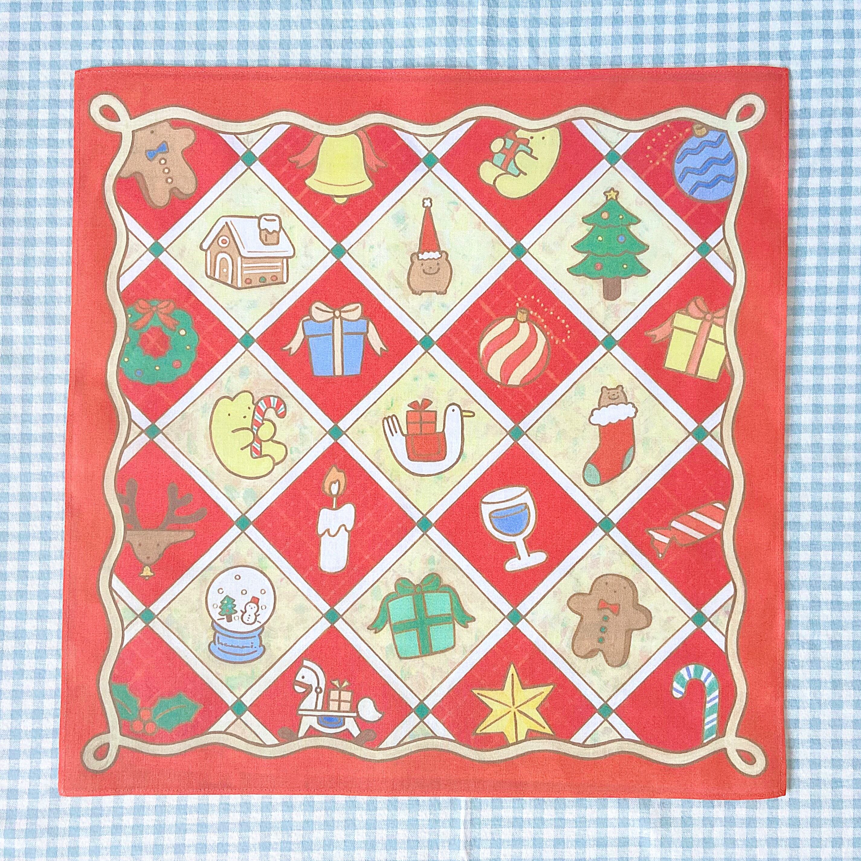 パッチワーク風のクリスマスな絵がプリントされたハンカチーフです。